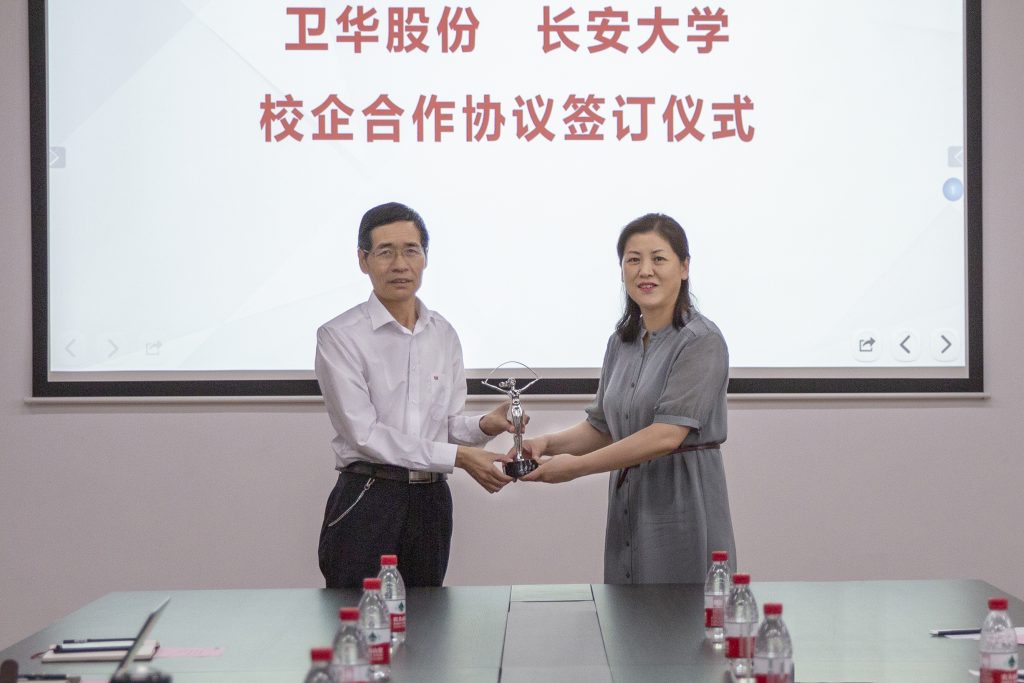 长安大学工程机械学院党委书记于丽娟将长安大学标志性建筑 “彩虹女神”的缩小版雕塑赠予ks凯时股份,这份珍贵的礼物也是ks凯时股份与长安大学友谊的见证。