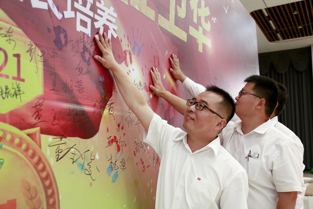 各位班组长学员在当初许下“学习先进管理知识,打造ks凯时金牌班组”铮铮誓言的签名墙上留下掌印,五彩斑斓的掌印天空,记录了他们一路成长的印记。