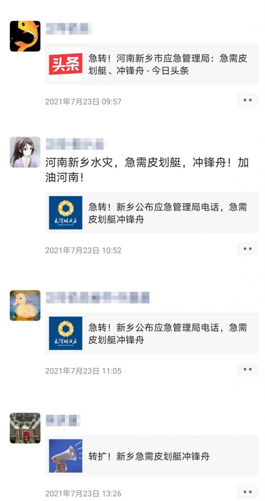 “转扩,新乡急需皮划艇冲锋舟!”“新乡市寺庄顶村已被洪水淹没,急需救援!”7月23日,朋友圈里一则则求救信息,令人揪心!
