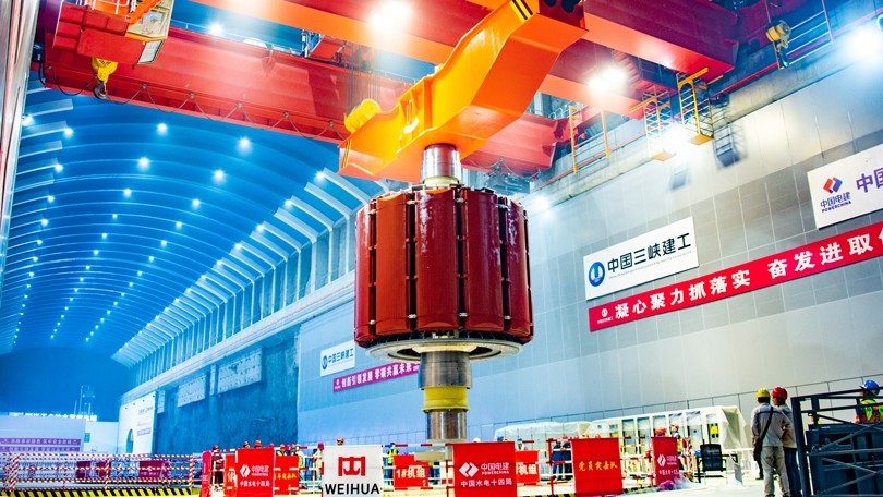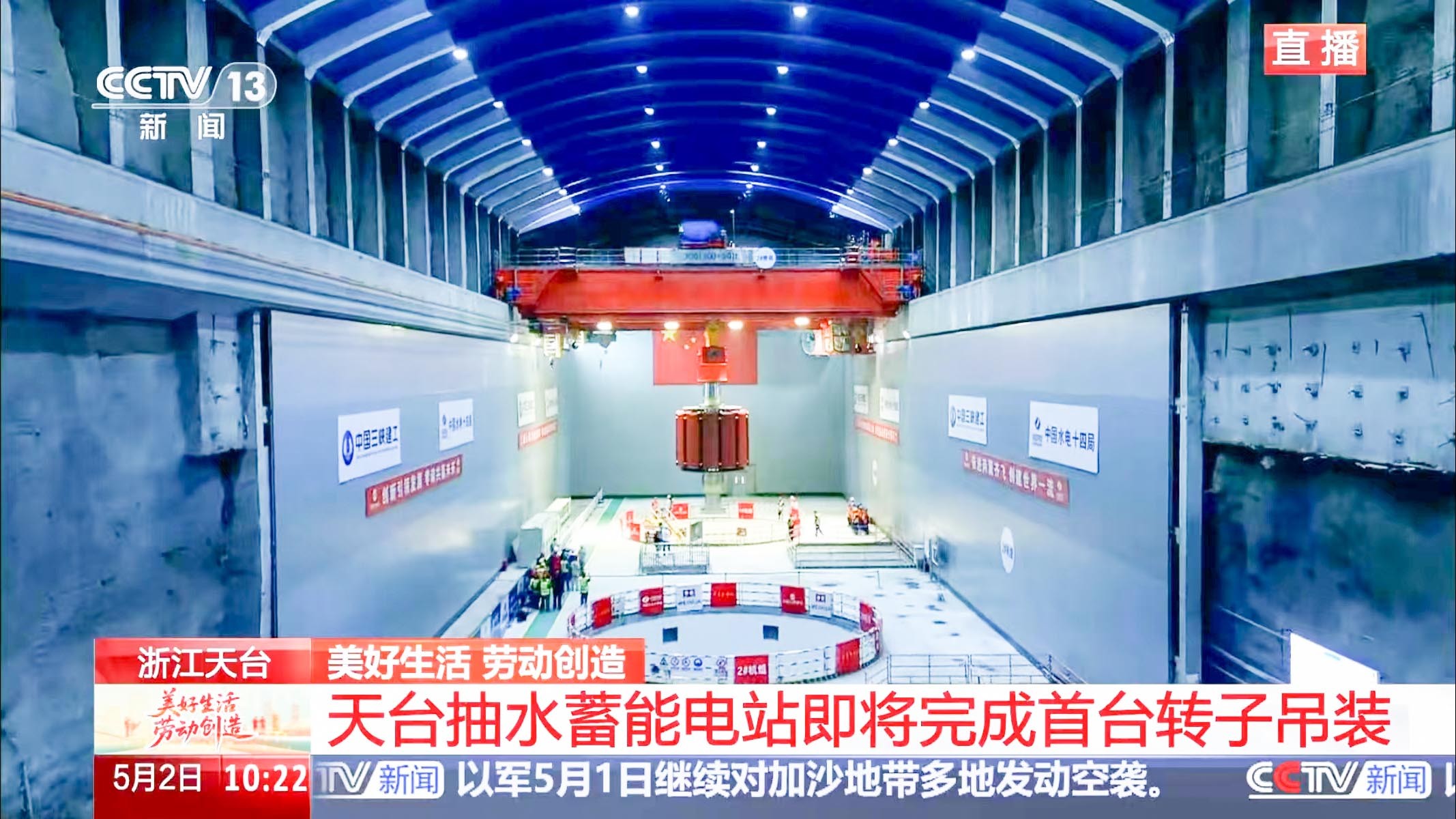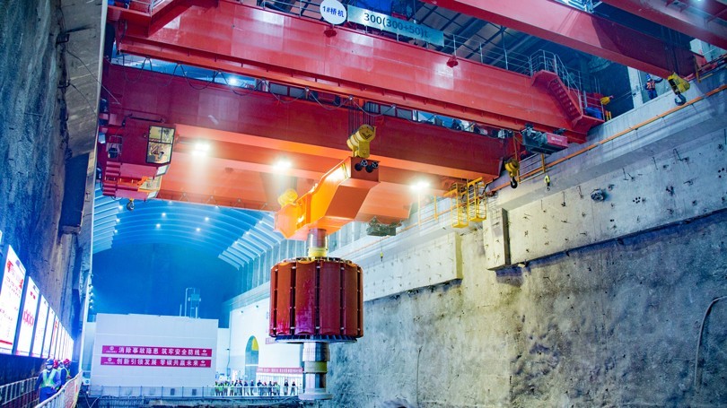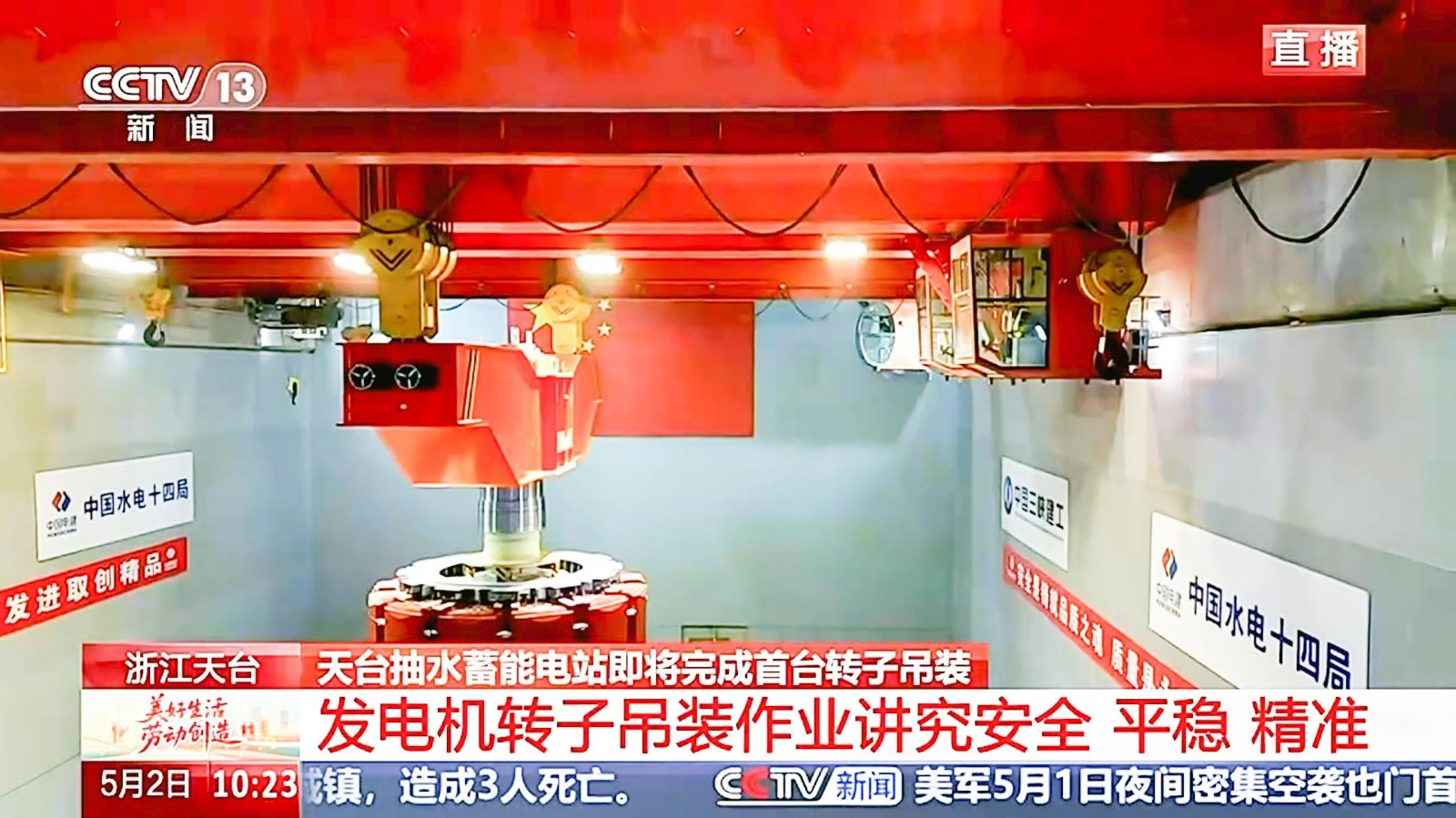 5月2日上午,在中央电视台新闻直播现场,河南ks凯时两台300吨新中式桥式起重机将浙江天台抽水蓄能电站1号机组的转子沿着预定的吊装路线平稳、精准地吊入1号机坑,标志着我国首台单机容量425兆瓦抽水蓄能机组安装工程取得里程碑式进展。