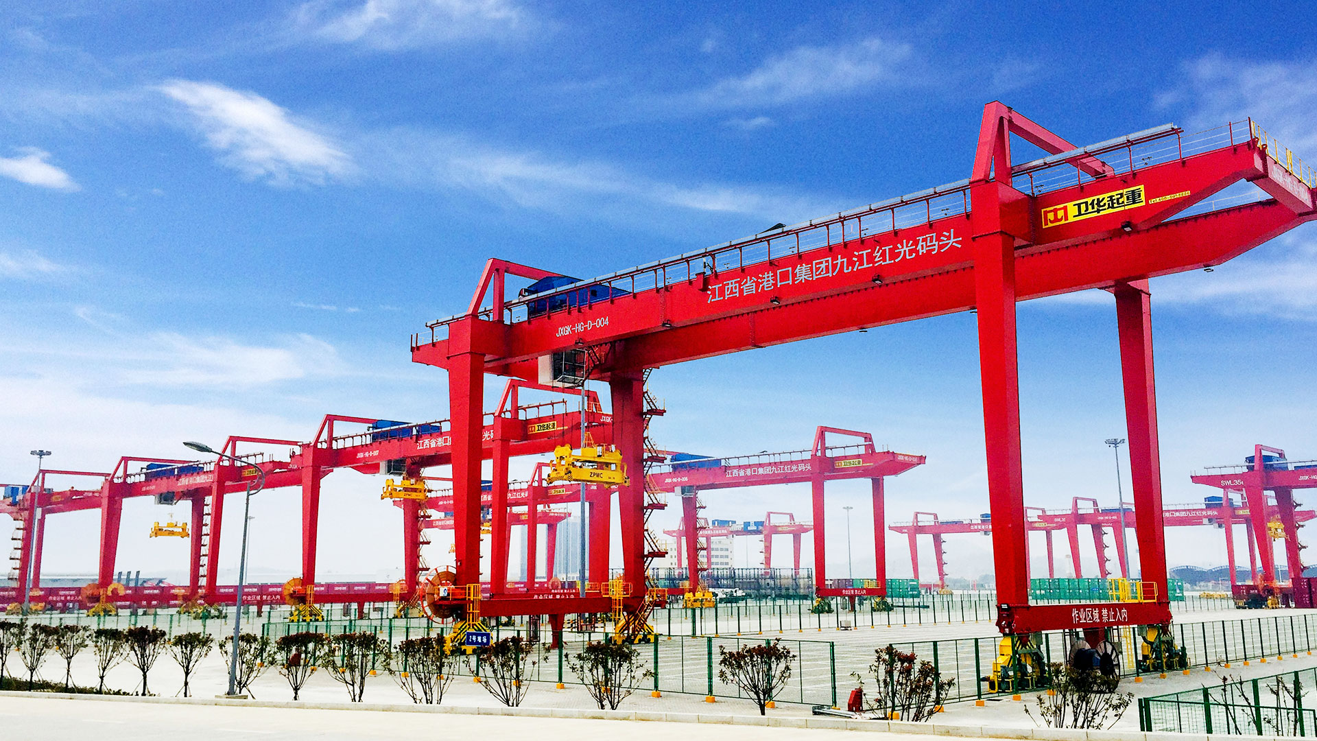 轨道式集装箱门式起重机(简称场桥)适用于港口、码头、铁路、物流等集装箱堆场或中转站的国际标准集装箱及铁路宽箱的搬运及装卸。通过多组钢轮支撑在轨道上,以市电为动力,由大车机构、小车总成、龙门架、动力系统、集装箱专用吊具等组成。