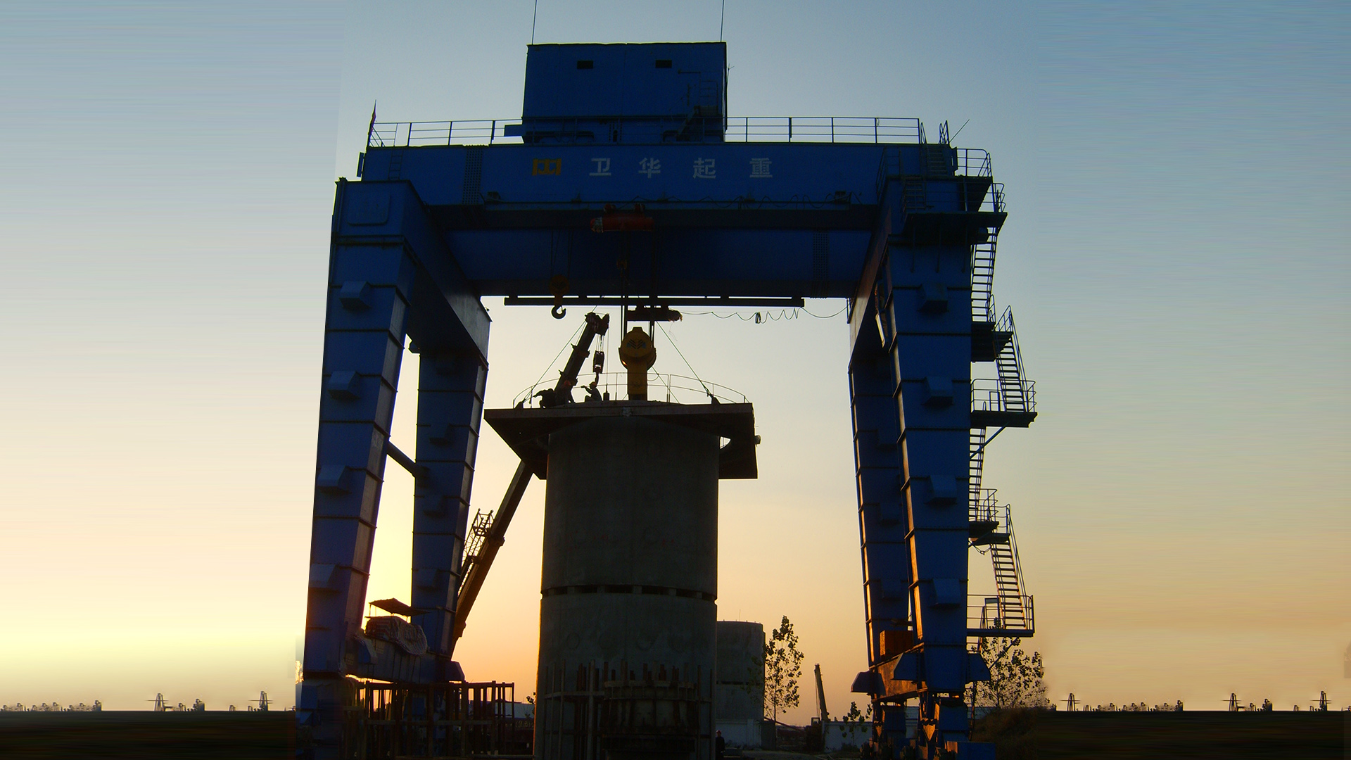 自顶升门式起重机和U型门式起重机类似,门架结构为U型门机,区别在于支腿不同。由于特殊工作场合,大型起吊设备无法进场,自顶升门机支腿制作成几段,每段支腿上都有千斤顶顶升支座。小车、主梁端梁组装好后,采用千斤顶顶起,依次将每段支腿用法兰连接到一起。之后安装下横梁、大车运行机构。
